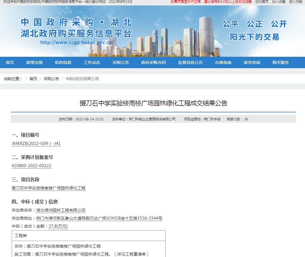 掇刀石中學(xué)實驗樓南樓廣場園林綠化工程中標(biāo)結(jié)果公告